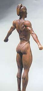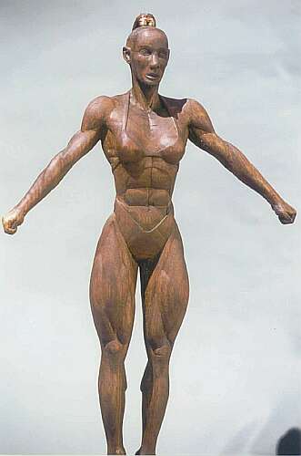This piece is made of black walnut, about 17 inches tall. It is finished with multiple, hand rubbed, coats of Danish oil. The arms were made separately and dowelled in place; this allows me to run the grain straight down the arms, which makes the piece stronger. I saw a photo of Lenda Murray, six time winner of the Ms. Olympia award and was inspired to do this piece. This is one of my iconoclastic image series. I started out to show a woman in a traditional man's role. I ended up calling it The Bodybuilder to emphasize that a label of Ms. Olympia still carries the prejudice that men and women are separate and unequal. Price $3700. USD Buyer pays all shipping fees, customs duties, etc. Item is shipped after payment is cleared (pro forma). Satisfaction is Guaranteed but returns are not accepted without first getting approval and details from the seller. |